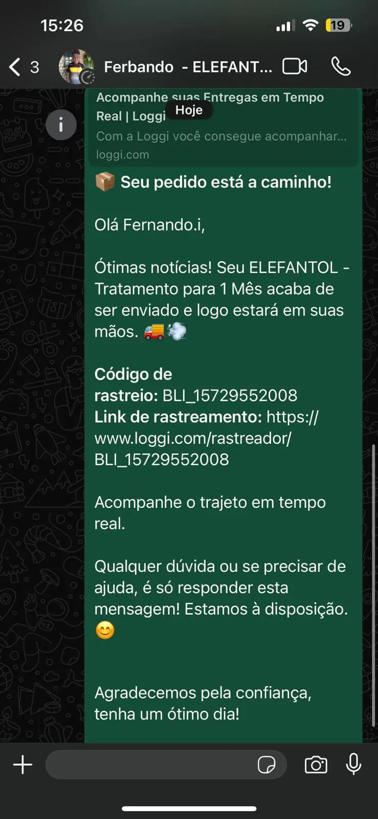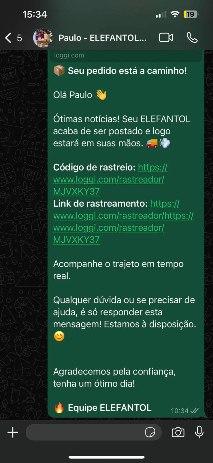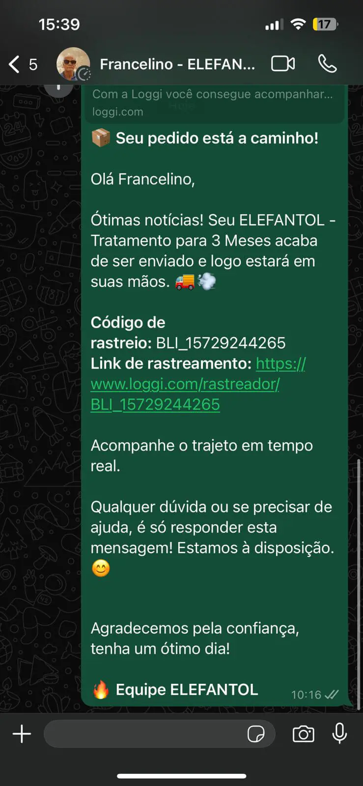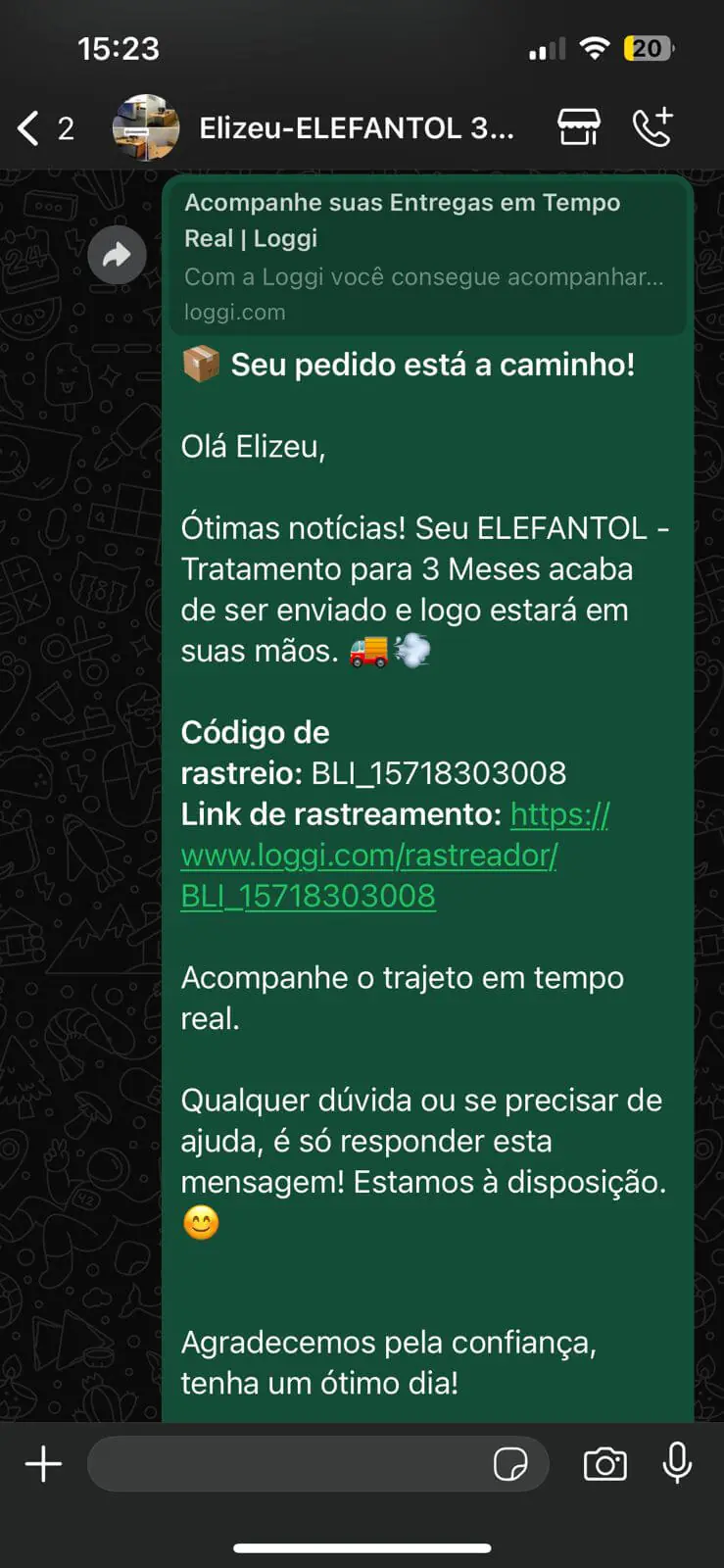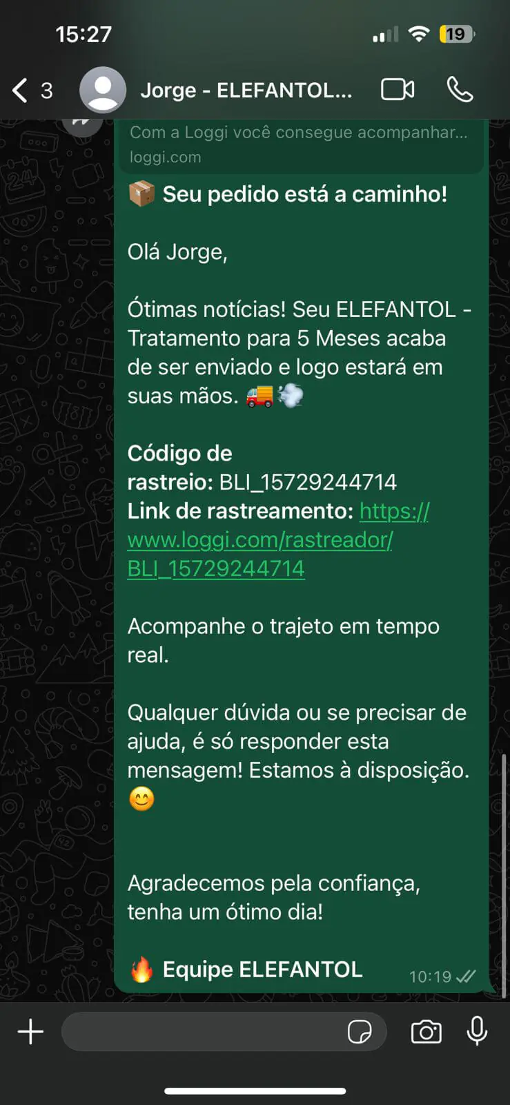 O prazo médio de entrega do Elefantol é de 5 dias úteis para o Sul e Sudeste. Para as demais regiões do país, o prazo de entrega é de 7 dias úteis, normalmente entregue antes. O prazo começa após a confirmação do seu pagamento pela administradora do seu cartão de crédito ou após a confirmação do pagamento do boleto.